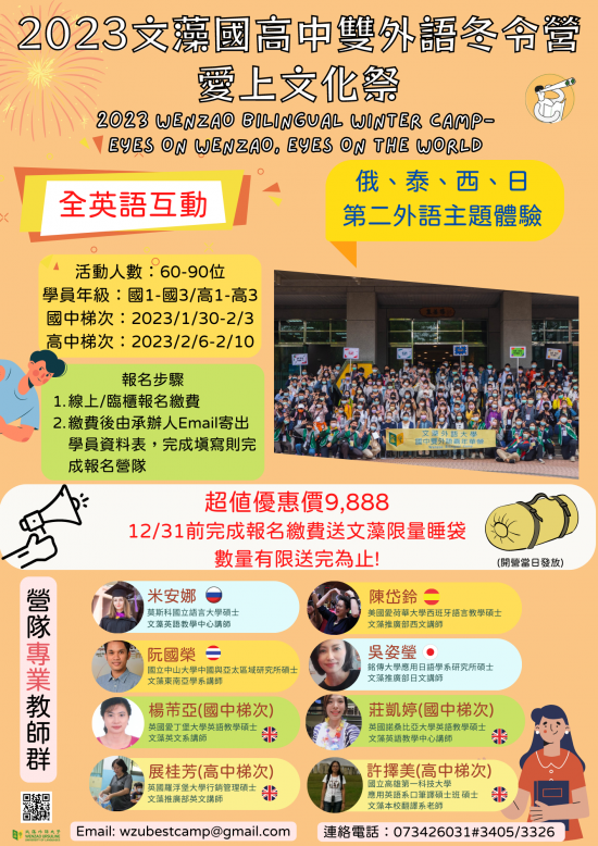 三、 活動對象:國中學生(採全英語教學與活動進行,報名時請檢附111學年度成績單英文70分以上或全民英檢初級初試通過證明)。