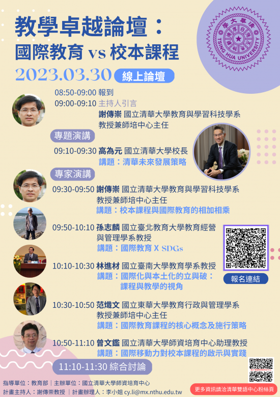 主旨:    函轉國立清華大學師資培育中心訂於112年3月30日(星期四)辦理「教學卓越:國際教育 vs 校本課程」線上論壇資訊,請貴校公告並鼓勵踴躍報名線上出席,請查照。